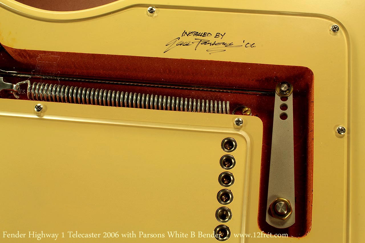 3-piece bridge with brass saddles; Seymour Duncan Antiquity pickups. Parsons-White B-Bender ‘Long Stroke’ installed (signed by Gene Parsons), two Keith tuners installed, replacing the A and High E tuners. Pickup switch knob is missing. |