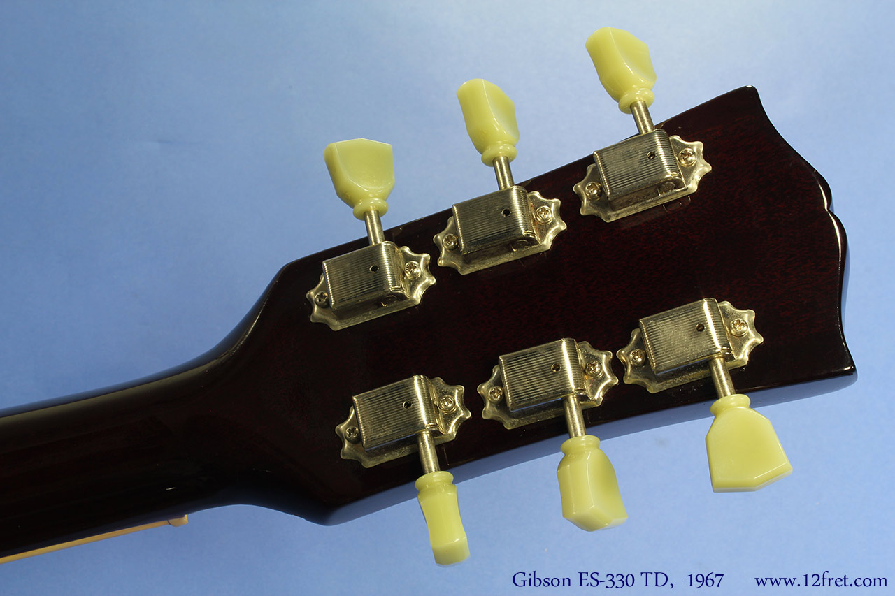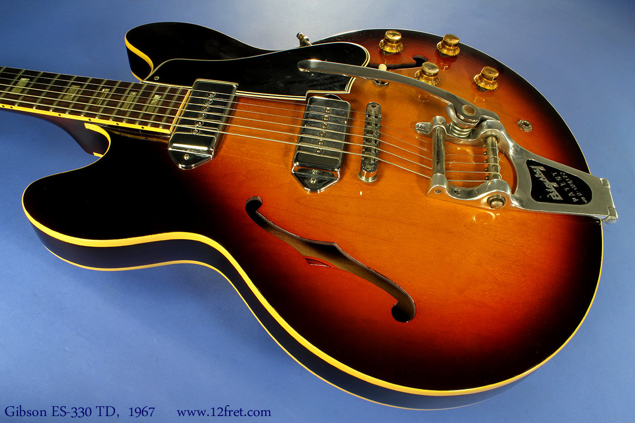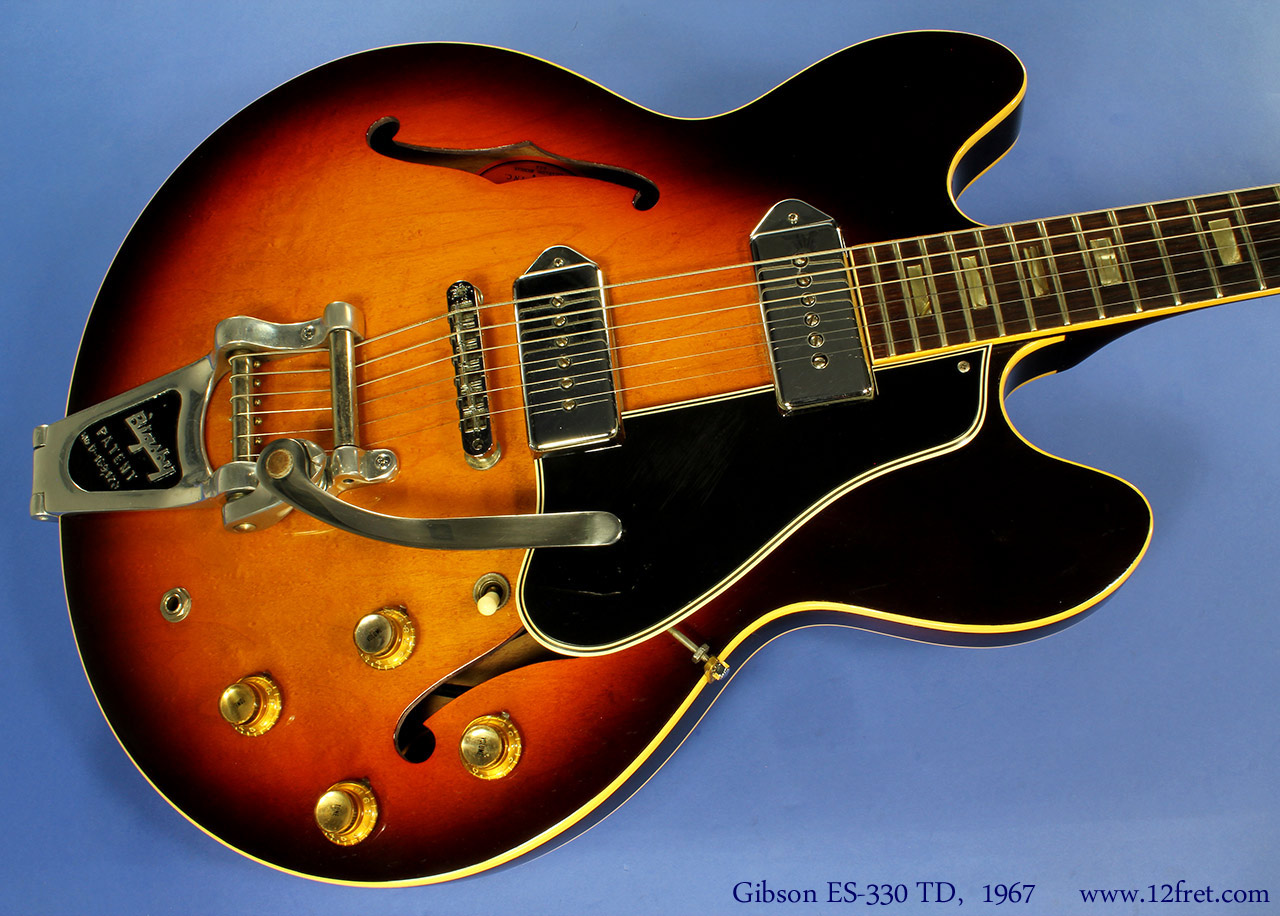 | Comments | The Gibson ES-330 was introduced in 1959 to replace the ES-225,and is cousin to the Epiphone Casino, famously used by John Lennon on many Beatles recordings. The ‘TD’ in the model number stands for Thinline, Dual Pickup. The ES-330 was discontinued in 1972, but is available again as a Gibson Custom Shop piece. This is a very nice 1967 ES-330, with a very good refinish done some years ago. It’s a great guitar to play; the hollow body is very light and comfortable and the 16-fret neck provides a much more ‘vintage’ tone and responsiveness than the late-production 19 fret necks. This is a very nice guitar. |