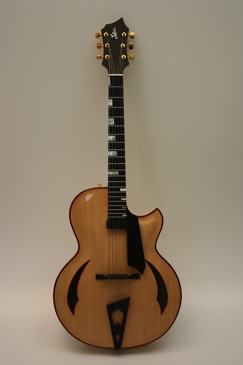 Jeff Letain builds innovative archtops in Sooke, British Columbia. We saw the Eraser at the Montreal guitar show and it had to come here! A unique feature of this guitar is the interior concealed neck block offering unfettered access to all of the upper frets. This innovation offers maximum playability and balances the instrument beautifully. Both the pin and the tail piece have a beautiful chevron design incorporated into them.Serial Number01, built May 2012.Pricing $5,500 CAD with case.NeckThe neck is a sandwich of maple, walnut, and carbon fiber. Unbound ebony fingerboard with mother of pearl block markers. 25″ scale length with 1 3/4″ nut width.Frets21 frets in total, with full access to all of them.BodyBearclaw sitka carved spruce top with flame maple back and sides. Padauk binding on the top and around the soundholes.FinishClear gloss nitrocellulose lacquer finish.Hardware/electronicsKent Armstrong floating pickup, volume control under the finger rest. The tailpiece is built of padauk, ebony and walnut on a brass core. Gold Gotoh tuners and adjustable ebony bridge. Ebony finger-rest.Playability/ActionPlays very well as delivered, and we will of course adjust it to the player’s requirements.CaseSKB case included.