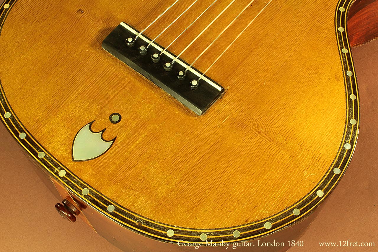 Here is a good English guitar bearing the label: George Manby, London. it has a spruce top with mother-of-pearl dot purfling around the edge and the sound hole.