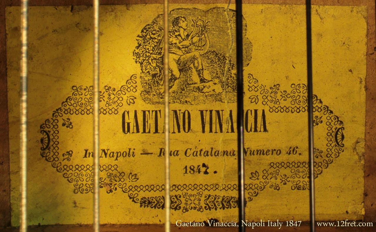 A good Italian romantic era guitar, bearing the original label: Gatenano Vinaccia, Napoli, anno 1847.